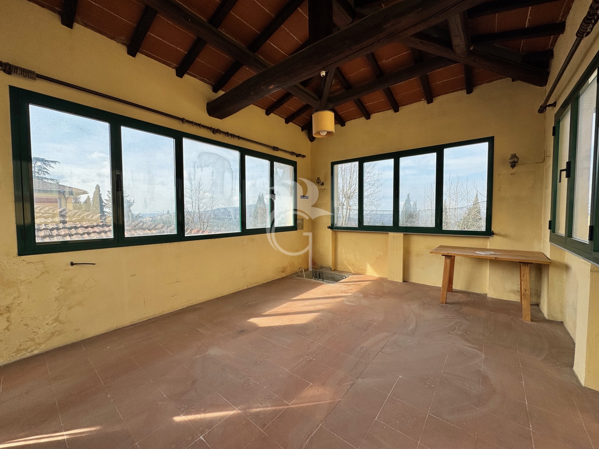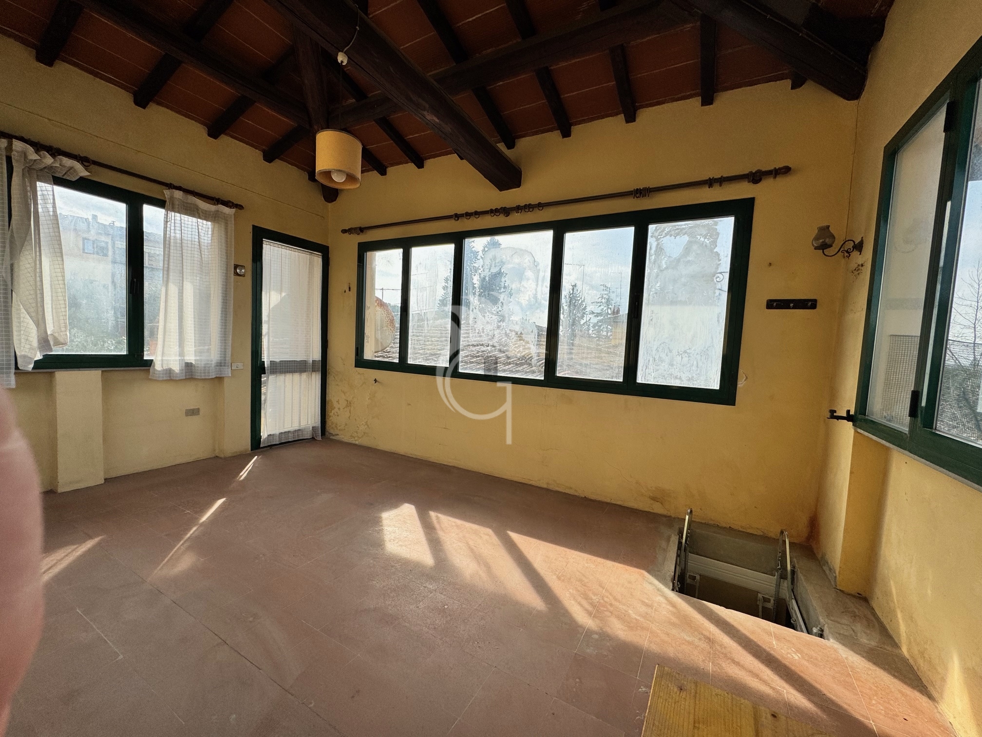 IMPRUNETA a due passi da tutti i servizi , dotata di un comodo garage sotto casa, con ingresso indiepnedente dall esterno di proprietà vendiamo una bella porzione di signorile villino bifamiliare distribuito tutto su un piano e composto da un bell’ingresso , scale in pietra serena, interni con altezze dell’epoca, vani grandi e luminosi e precisamente un sala doppia con due belle finestre da cui si vedono tutte le colline circostanti, tre camere da letto matrimoniali ed una bella cucina abitabile, due bagni di cui uno molto grande entrambi dotati di finestra, Ripostigli. Giardino esterno e terrazze godibili, spazio ad erba ed olivi, silenzioso e luminoso. Unica e particolare nel suo genere la loggia chiusa molto grande e con finestre a 360°. L’immobile ha quel sapore antico e deve essere rimodernato .